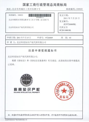 科亮知识产权商标注册申请已被国家商标局正式受理