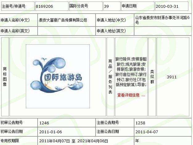 5月30日,山东鲁旺知识产权服务有限公司将“国际旅游岛”商标放在“无形资产交易大厅”网,以2380万元的交易价格为的标转让。注册证号:8169206,该商标涵盖了:旅行安排、旅行预订、观光旅游、安排游览、旅行陪伴、安排游艇旅行、旅行座位预订、导游等项目,涵盖了旅游服务的主要类别,进一步吸引了业界的关注。