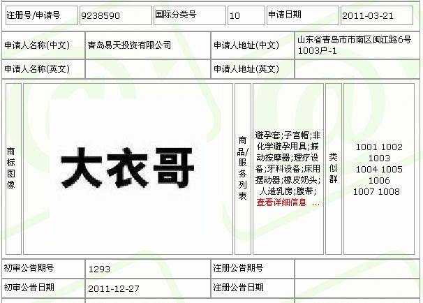 经检索,“大衣哥”已被其他企业抢先注册申请在第10类“避孕套”商品之上,目前该商标已被国家商标局初步审定通过。依据《商标法》之规定,该商标于2012年3月26日之前无异议,将核准下发《商标注册证》。