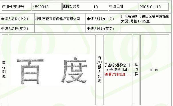 深圳市夜来香保健品有限公司,于2005年4月13日向国家商标局申请“百度”作为避孕套商标,2008年2月14日核准注册。百度公司于2010年3月29日向国家商评委提出商标争议申请,国家商评委于2011年12月2日评审结案,裁定维持深圳市夜来香保健品有限公司的商标专用权。百度公司不服商评委的裁定,诸向北京市第一中级人民法院提起诉讼。